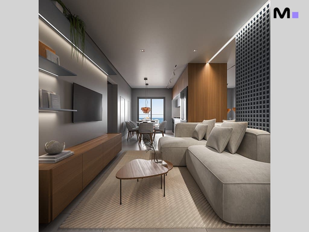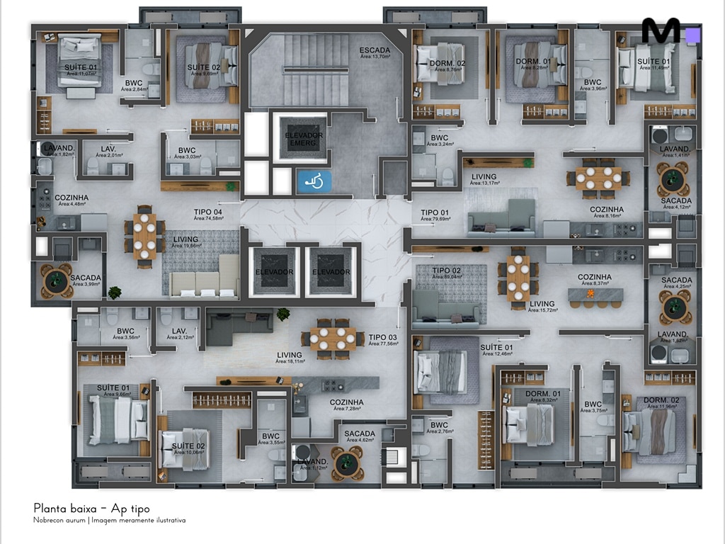 Os apartamentos contam com piso em porcelanato, teto rebaixado em gesso, medidores individuais de água, energia e gás, além de tubulação para água quente.
