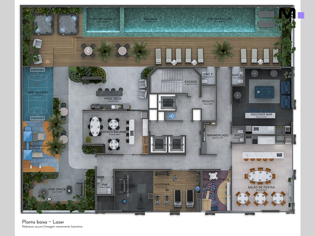 O projeto dispõe de uma área de lazer de 700 m², reunindo diversos ambientes, como piscina com prainha, piscina infantil e aquecida, spa, hidromassagem, academia, brinquedoteca, playground, salão de festas e áreas gourmet. O empreendimento também traz facilidades modernas, como coworking, mini mercado, lavanderia e sala de beleza.