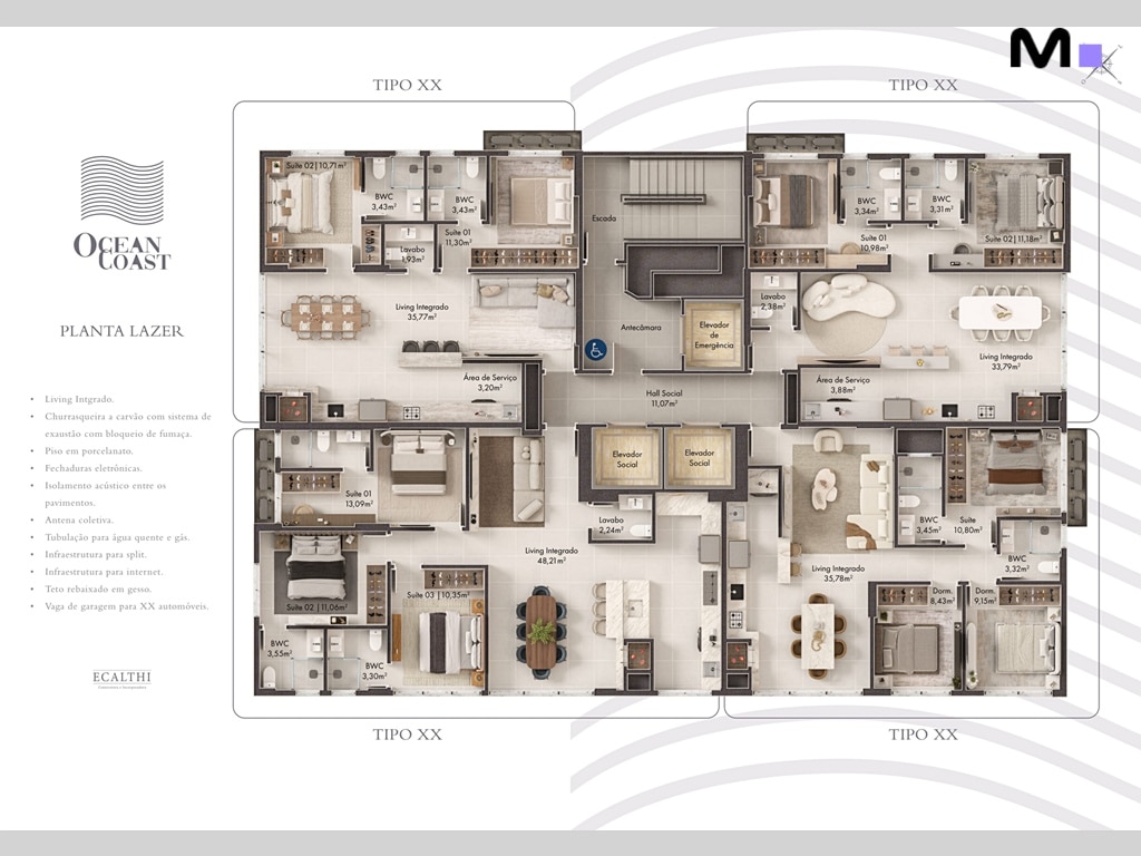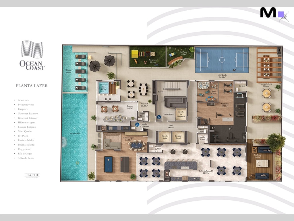 A área de lazer do Ocean Coast é totalmente mobiliada e equipada, incluindo piscina adulto e infantil, deck molhado, salão de festas, sala de jogos, pub, brinquedoteca, playground, espaço pet, fire place, academia, hidromassagem, espaço gourmet com área externa e mini quadra, garantindo opções para toda a família.